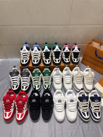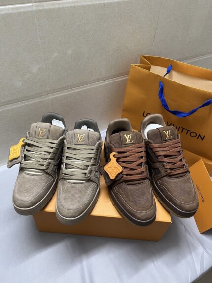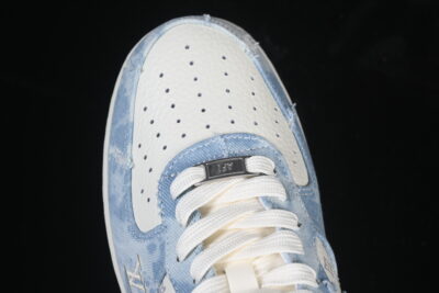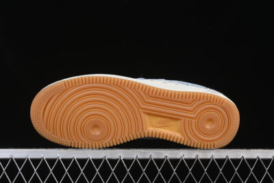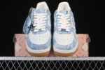 This unique sneaker combines the classic Nike Air Force 1 silhouette with the luxurious touch of Levi’s and Louis Vuitton fabrics. The design features a blend of light blue denim and premium leather printed with the iconic LV monogram, along with the signature red Levi’s tag on the heel. The white midsole and honey-colored outsole create the perfect balance between elegance and sporty style.
